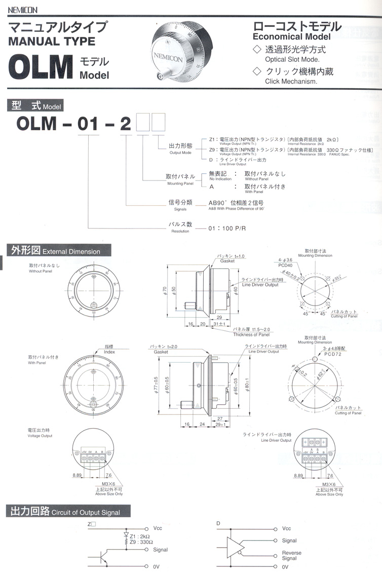 NEMICON ENCODERS: 請聯結下載 PDF 檔案型錄: ABSOLUTE ENCODER ASC-SP (Absolute) AEW-8-G ASS-256-B ASC-SP-256-G ASC-HP-10-G MAR-H (Hybrid Multi-Turn) MANUAL SET CNC用手動譯碼器 HP-L01 (MANUAL Set:Handy-Wheel) -1 -2 HP-V0025 (MANUAL Set:Handy-Wheel) HP-D RS232C Handy Pandent OSM (DC5-12V Handy) OLM (DC5V Handy) OLM2 -(NEW MODEL) OLM2-1 OLM2-2 OLM2-3 OVM (DC5-12V) UFO (Thinner Handy) UFO-2 HES -(Hollow)-8mm/6mm HES-1 HES-2 HEF -(IP-65)-Hollow Type HEF MKE-500-2 NE-1024-2MDF (Super Heavy Duty) -1 -2 -3 NOC-SP(Shaft 10,000ppr) NOC-HP (Hollow 10,000ppr) NOC-HP -1 NOC-HP-2 NOE (5000 Pulses) NOE-中文簡介 OEW (6mm Shaft) OEW2 (6mm Shaft) OEW2-A OEW2-B OVW2 OVW2-1 OVW2-2 OVF (8mm/6mm Shaft_IP65) OVF-1 OVF-2 OSS (4mm Shaft) OSS -A OSS-B 外型樣式 OPN (Heavy Duty) OEL OEK -1 OEK-2 OMS-125-2T OME-A-100-2MCA OME-T OME SB Built-in Series SB Built-in Series (Introduction) SBT (Big Size built-in) SBI -1 -2 SBH SBY (For Servo-motor) PA-1010 PA-1015 Gear Sensors 8H-12R Couplings SRJ SCT (SCT-16/ SCT-25/ SCT-32/ SCT-40) SGL-C : Couplings for NE-1024 or NE-2048 BC-0810 金屬連軸器_原廠 Original Couplings CE Certificate 認證書 Certificate TUV,CE,ISO9001 譯碼器和馬達接線方式→防止干擾 Cable,Cord,Plug & Connector for HP-L01 手輸附件 How to select The Model ? 規格選擇 General Graphics 外型簡介 Genernal List 分類外型簡介 Applications Chinese applications 簡體應用範例